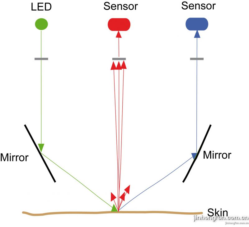 皮膚表面光澤度是由照射到皮膚表面的光的直接反射和散反射來反映的。在探頭頂端由 LED產(chǎn)生的一束平行白光通過一個(gè)平面反射鏡后以60°角射向皮膚表面,一部分光以同樣角度 被直接反射后通過另一個(gè)平面反射鏡射向一個(gè)接收傳感器。另一部分光被皮膚表面散射后被一個(gè)位于皮膚垂直方向上的傳感器接收。這樣皮膚光澤度測(cè)試探頭GL200不僅能測(cè)試與光澤 度有關(guān)的被皮膚直接反射的光,也能夠測(cè)試被皮膚散射的光。